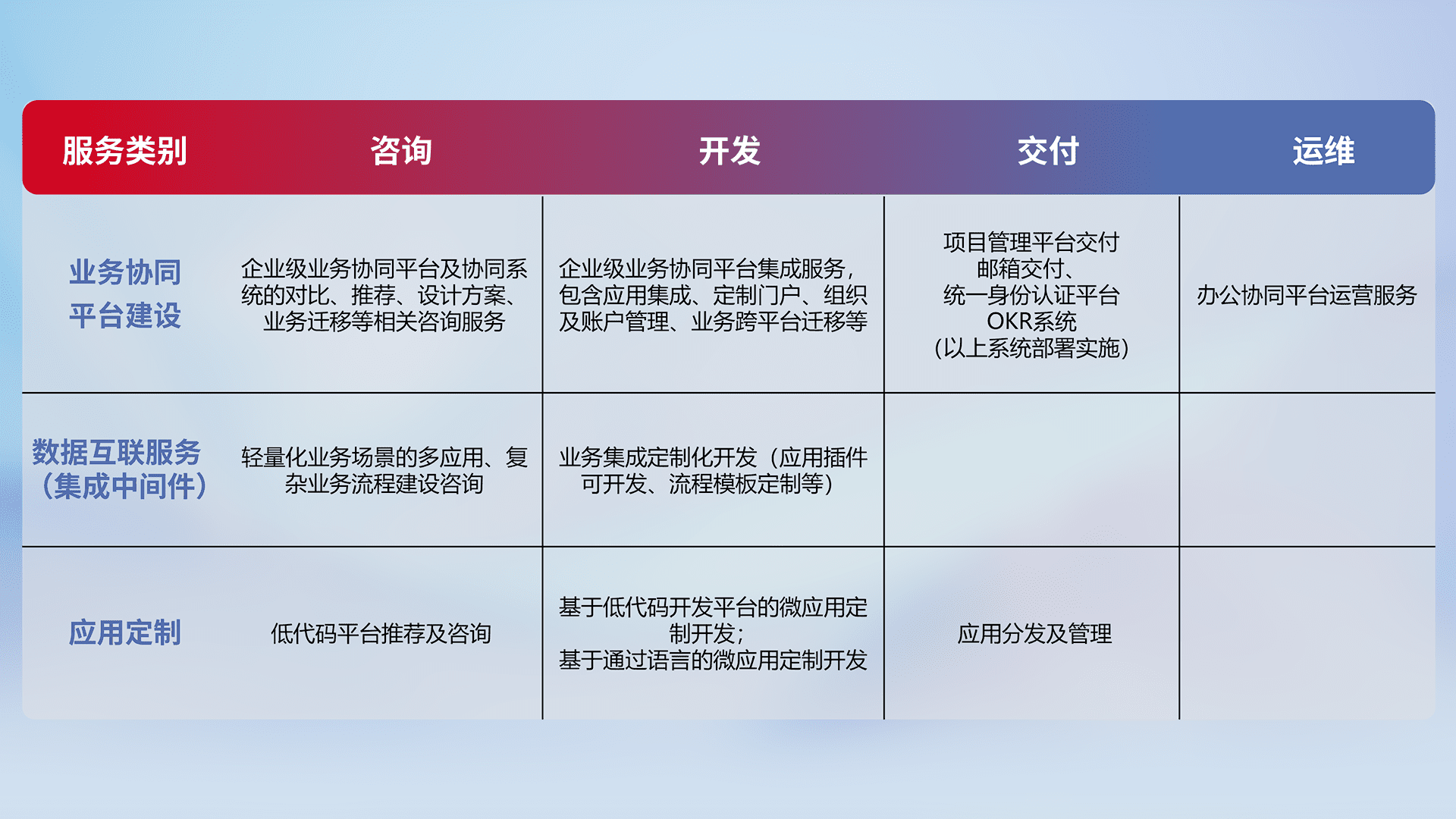 针对钉钉、、企微、、、、IDaas等平台级产品提供产品的规划、、、、方案、、、、交付、、定制化开发等服务,,,,实现如统一协同办公、、、、智能客户服务、、、混合会议管理、、、智能数据查询、、、、等业务场景,,,实现数字化转型。。